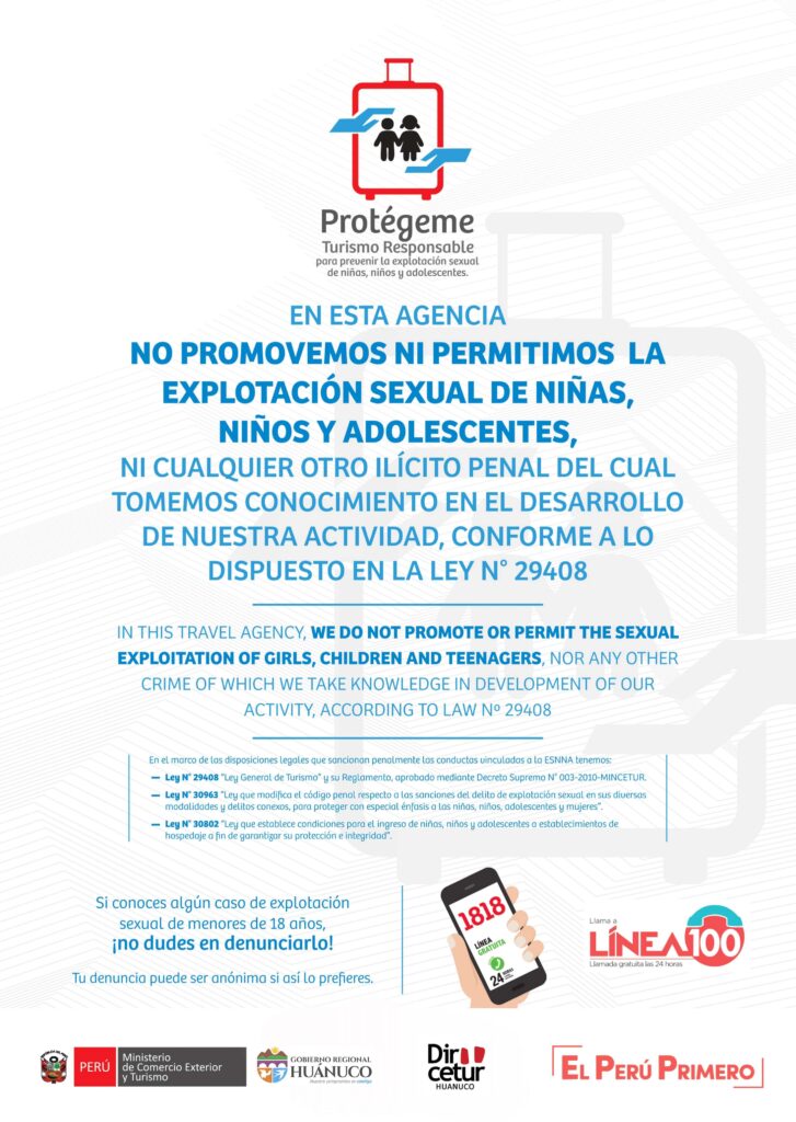 La explotación sexual infantil es una violación a los derechos de los niños, niñas y adolescentes, que afecta su desarrollo físico, psicológico y social; niega su derecho a la supervivencia, a su participación en asuntos que la afectan, y van contra el interés superior del niño. La Explotación Sexual de Menores de Edad consiste en el uso de Niños y Niñas Adolescentes con fines sexuales, pornográficos o eróticos a cambio de un pago, promesa de pago u otro beneficio. Esta es una forma de violencia y constituye una violación de sus derechos. En la Agencia TINKUS TOURS TINGO MARÍA Rechazamos, denunciamos y condenamos la Explotación Sexual de Niñas, Niños y Adolescentes - ESNAA Asumimos el código del menor y del adolescente, como principios de protección contra todo tipo de explotación laboral.